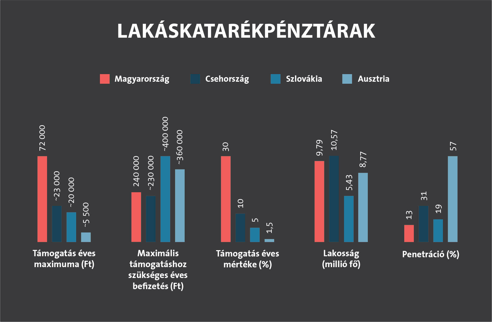 Magyarországon a lakástakarékpénztári befizetések után 30 százalék állami támogatás jár, aminek felső határa évi 72 ezer forintban maximalizálható. Ausztriában ez utóbbi összeg csak alig több mint 5 ezer forint, Szlovákiában 20 ezer forint körüli, de Csehországban sem kúszik fel 25 ezer forintnak megfelelő korona fölé.